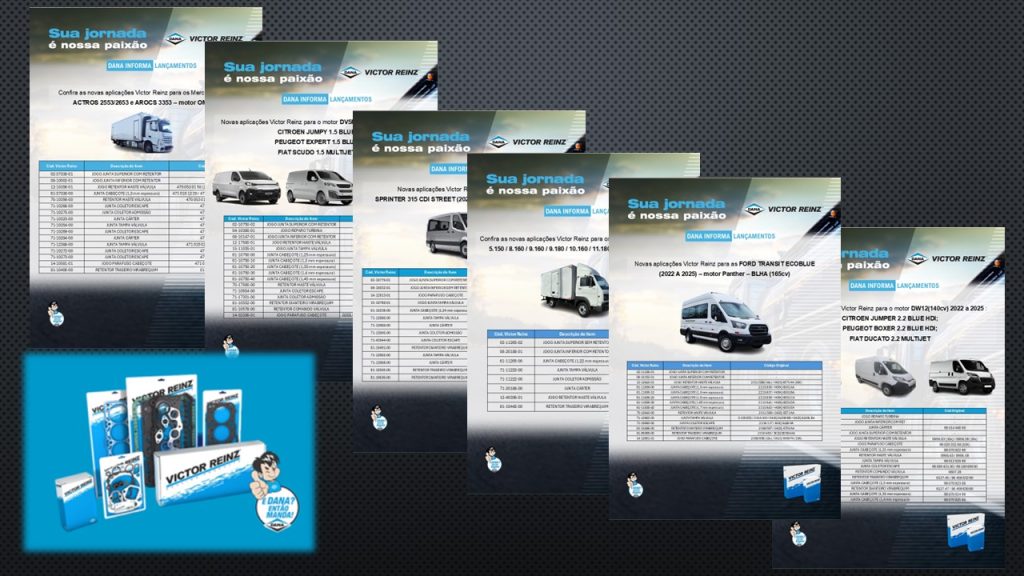 A Victor Reinz é líder mundial no segmento de sistemas de vedação e traz uma robusta atualização no portfólio da marca, com jogos de juntas, retentores, juntas avulsas, parafusos de cabeçote para caminhões e veículos utilitários de serviços das montadoras Citröen, Peugeot, Fiat, Mercedes-Benz, Volkswagen e Ford.