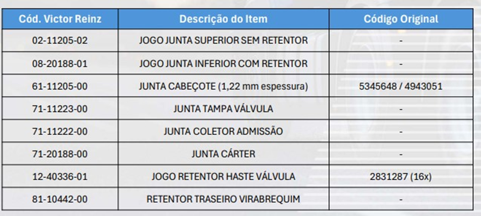 Confira a tabela com os novos componentes Victor Reinz e seus códigos: