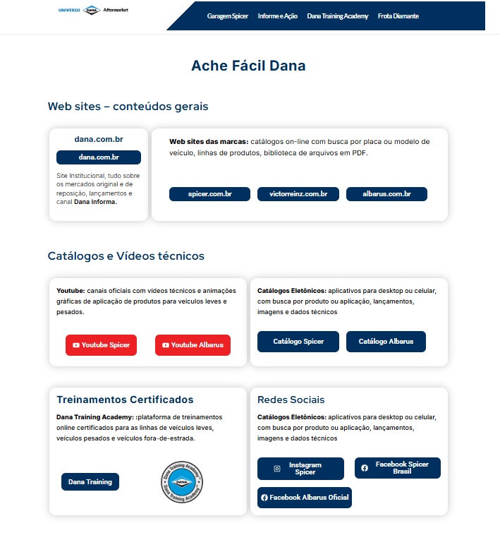 Este serviço é a síntese da proposta do portal Universo Dana. Ao clicar neste botão de acesso, todos os sites, redes sociais, catálogos, treinamentos e tudo que se refere a Dana ou das marcas Spicer e Victor Reinz.