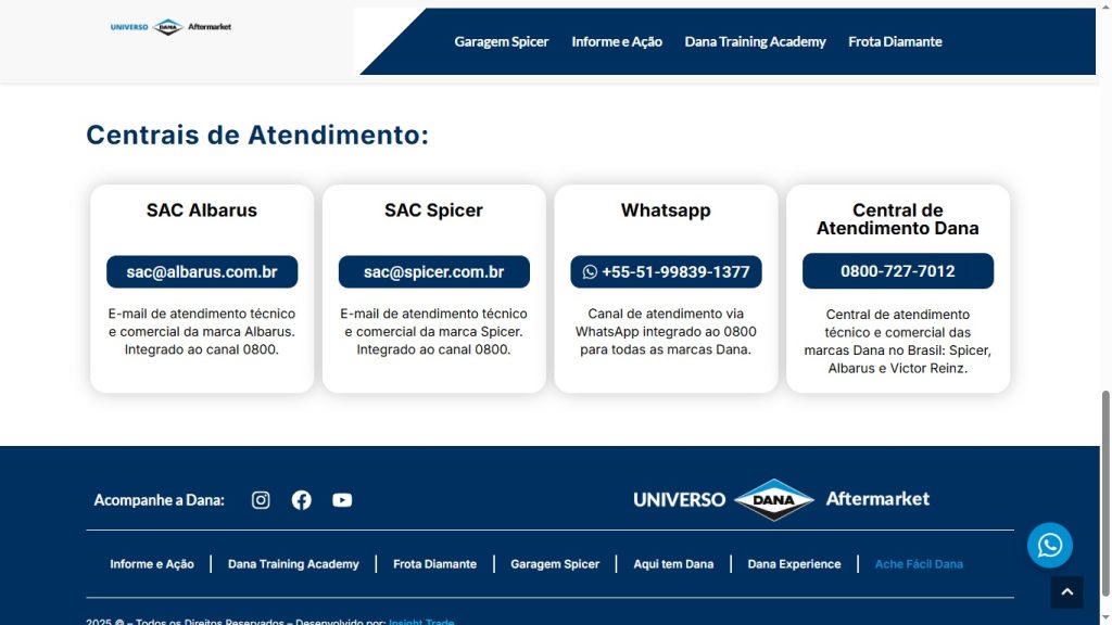 Outro serviço de utilidade no Ache Fácil Dana é o Central de Atendimento, onde estão todos os canais de contato da empresa, com link para os e-mails do SAC Albarus e Spicer, o canal de atendimento via WhatsApp integrado ao 0800 para todas as marcas Dana e a Central de atendimento técnico e comercial das marcas Dana no Brasil.