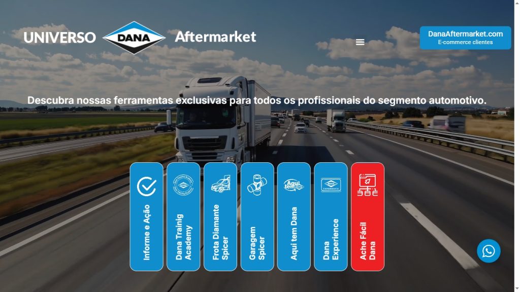 A página de abertura do portal contém todos os botões de acesso para conteúdos específicos e detalhados sobre os produtos e serviços Dana, garantindo mais praticidade no dia a dia de distribuidores, varejistas e oficinas.